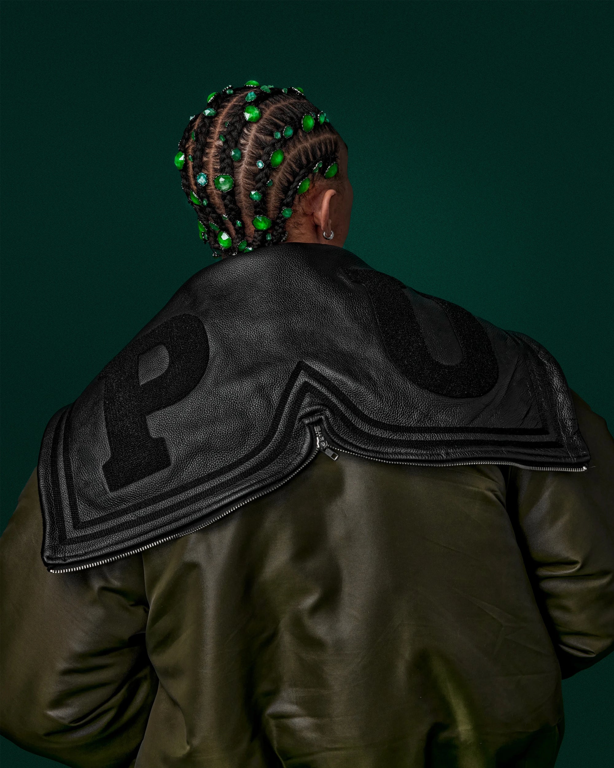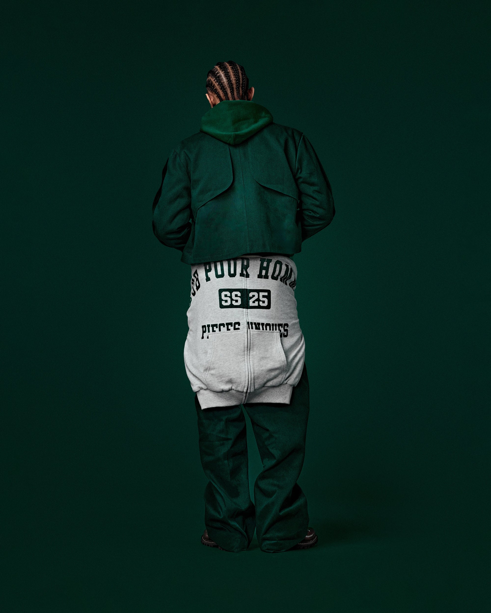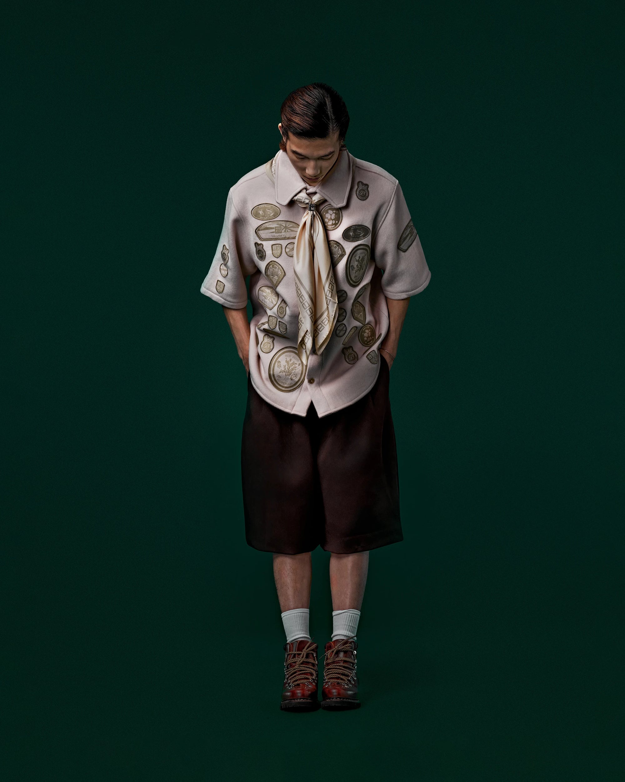 Drawing inspiration from Japanese workwear, military attire, vintage biker aesthetics, American preppy style, and vintage sportswear, LUU has crafted a collection that blends diverse cultural influences. The collection is dominated by bold lettering inspired by American letterman designs, showcased on knitwear and jersey, and creatively adapted to more conceptual pieces. Central to this collection is the use of Jade stone, a significant element in Edmond’s Asian heritage.