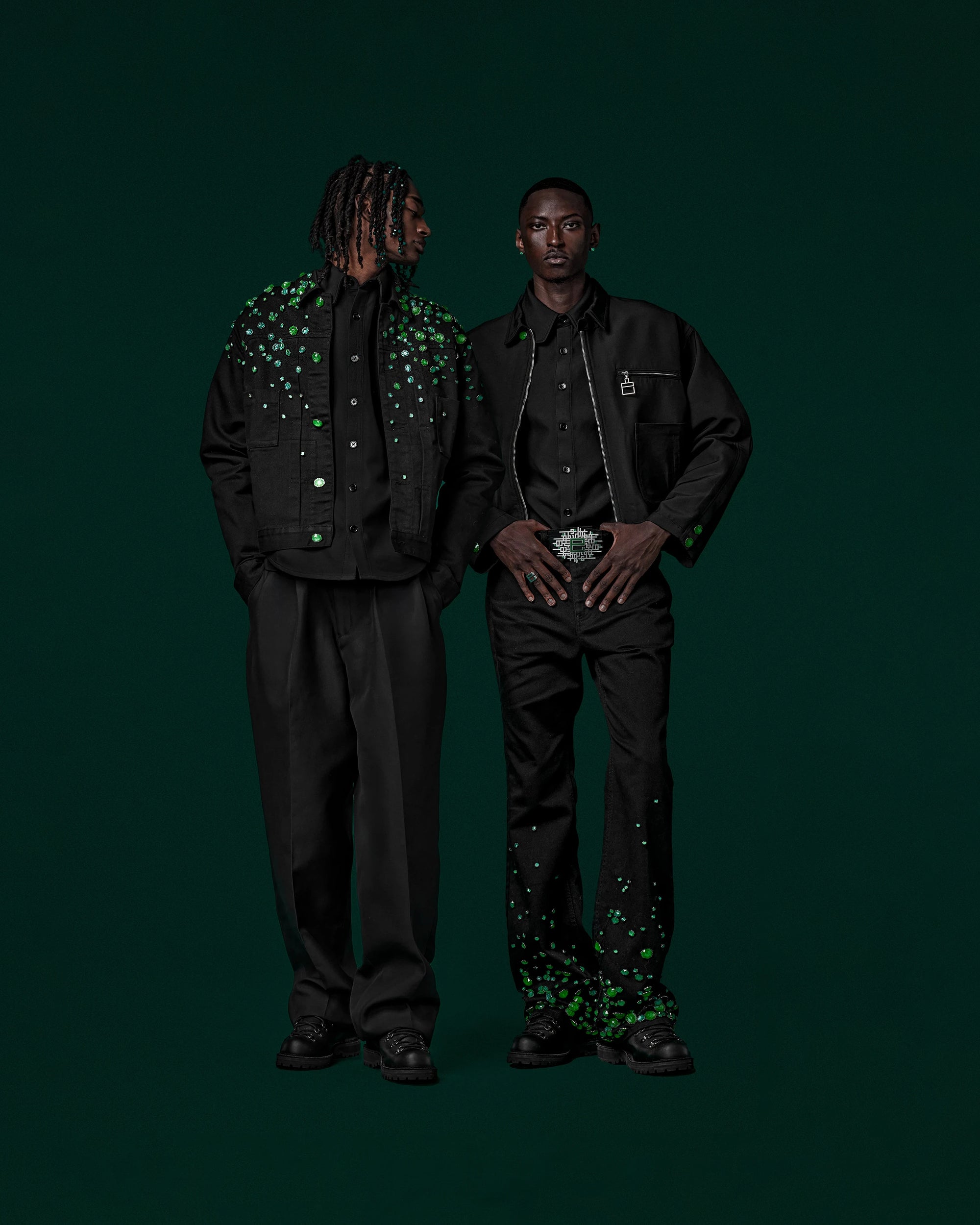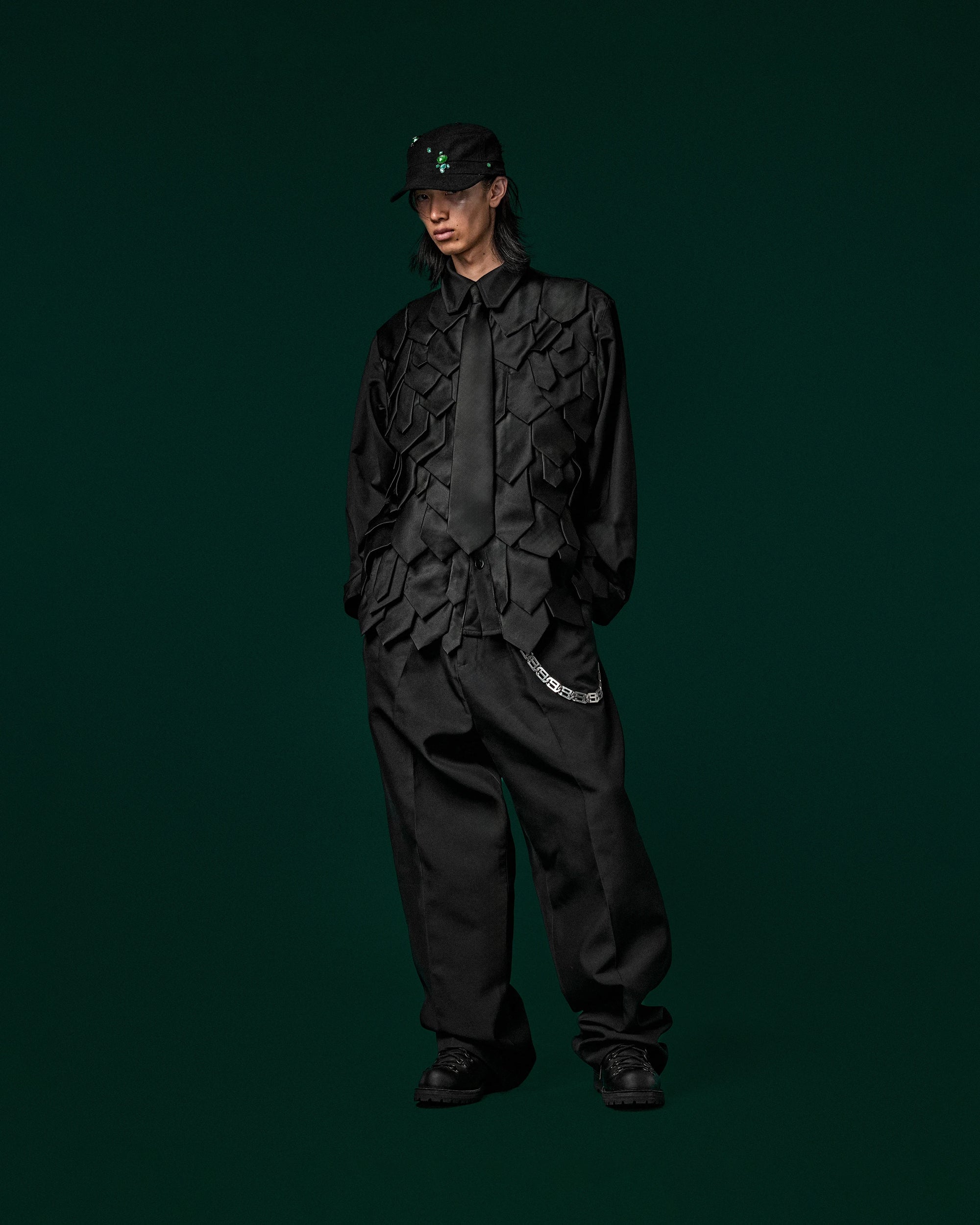 Inspired by a narrative centered around a jade mine, the stone serves as an embellishment throughout the collection— from buttons to embroideries on denim sets—symbolizing the labor and social stratification associated with the mine from a pants, to a jacket, to a special hat designed in collaboration with upcoming Parisian brand Abela. Additionally, LUU reimagines the workwear staple, the tie, layering hundreds of them to make it a layered camo fabric. This innovative approach underscores the collection’s commitment to merging tradition with contemporary design.